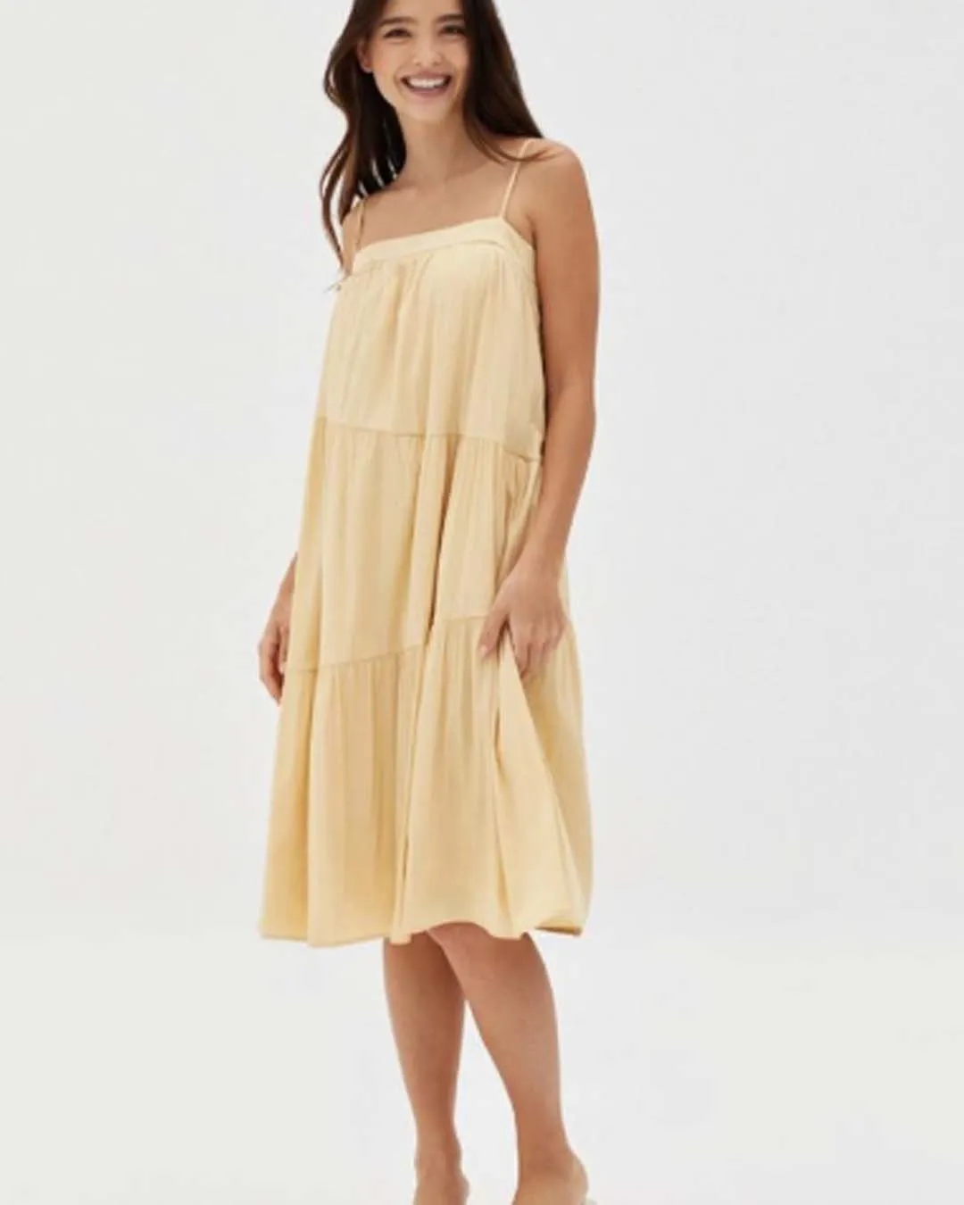 double strap babydol tiered midi dress